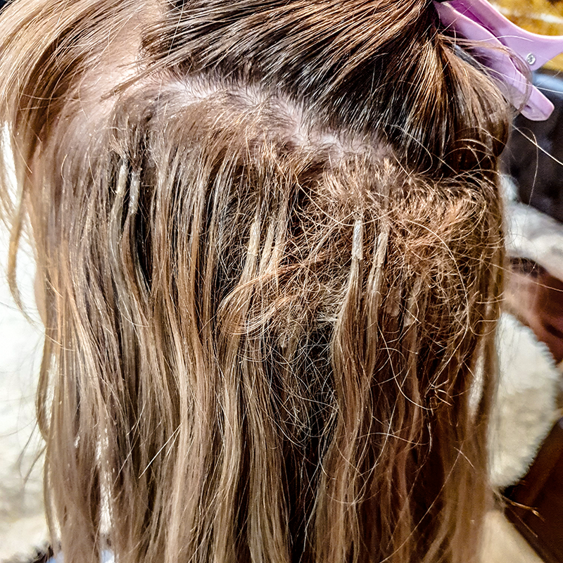 Перед процедурой волосы очищаются от укладочных средств и себума для обеспечения качественной фиксации креплений.